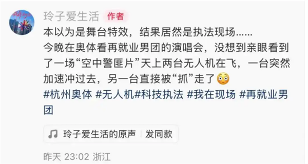 据网友发布视频显示,她在观看再就业男团演唱会前夕,于杭州奥体中心外围看到一架警用无人机抓捕了一架“黑飞”无人机,警用无人机用抓捕网将另一架无人机带回到地面上。