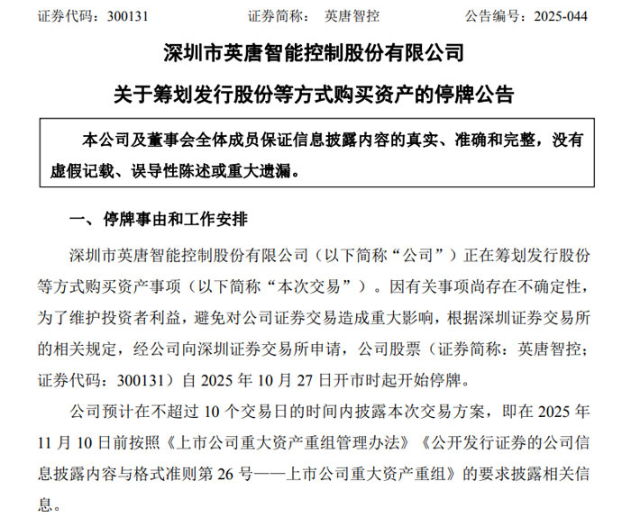 10 月 27日,深圳市英唐智能控制股份有限公司(证券代码:300131,证券简称:英唐智控)发布公告,宣布正筹划以发行股份等方式购买资产,为维护投资者利益、避免公司证券交易受重大影响,经向深圳证券交易所申请,公司股票自 2025 年 10 月 27 日开市起正式停牌。