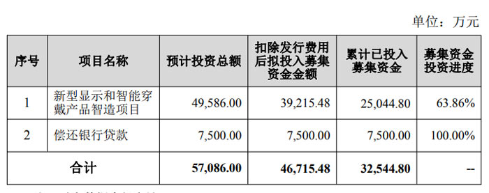 新型显示和智能穿戴产品智造项目:预计投资总额 4.96 亿元,扣除发行费用后拟投入募集资金 3.92 亿元,累计已投入 2.50 亿元,投资进度达 63.86%;