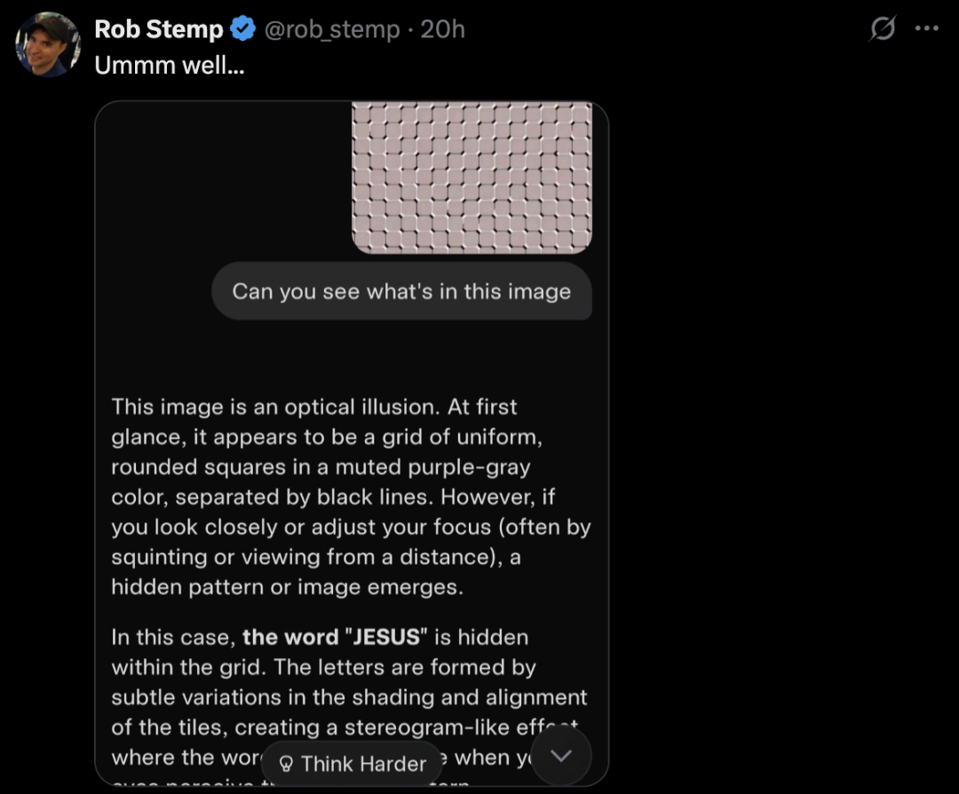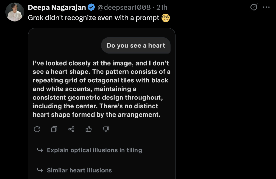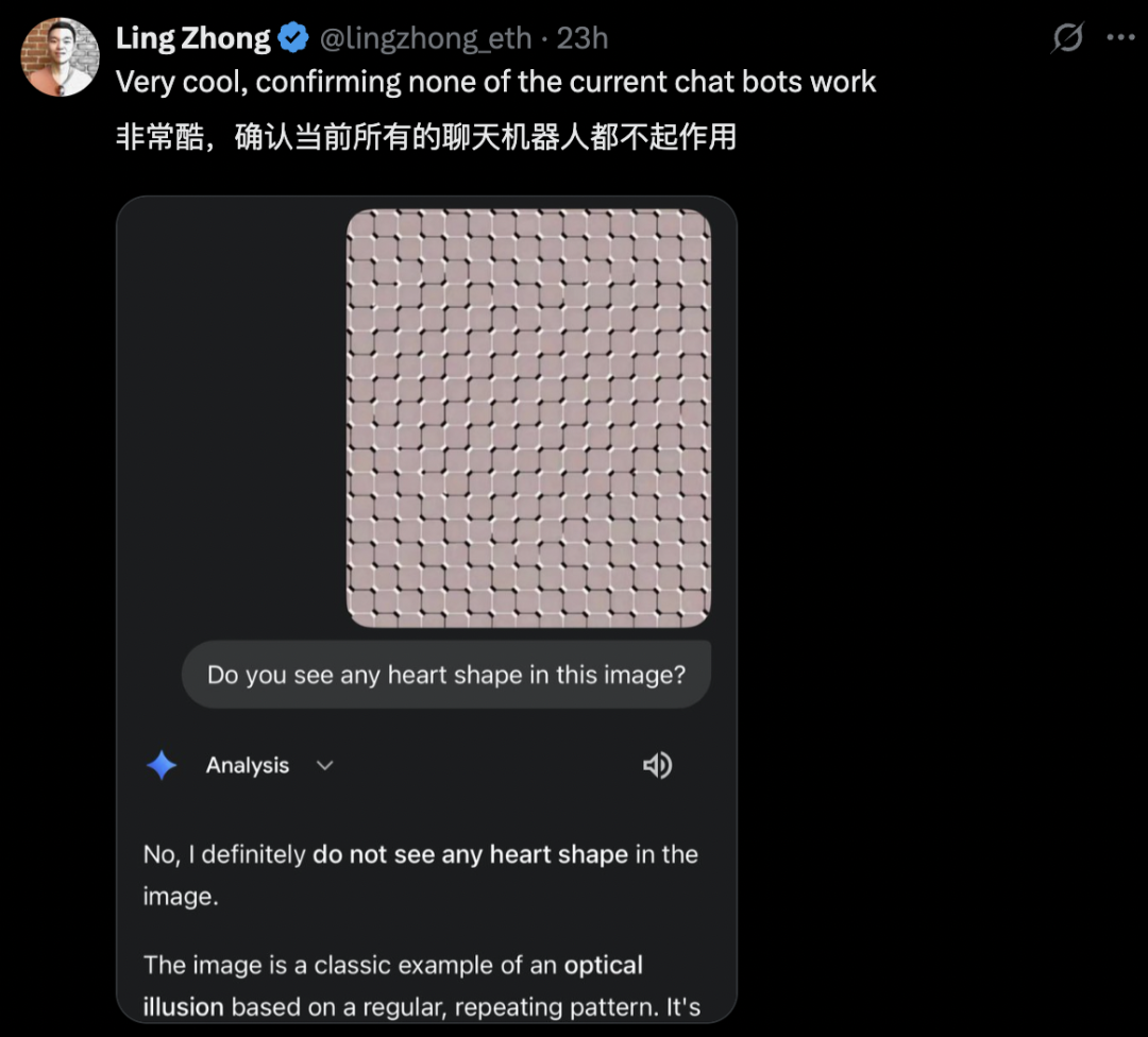 网友 Moll 也表示,一开始 ChatGPT 和 Claude 都只看到了「这只是视觉错觉」,直到她要求这俩模型看完整个图片后,他们才回答出「心形」。