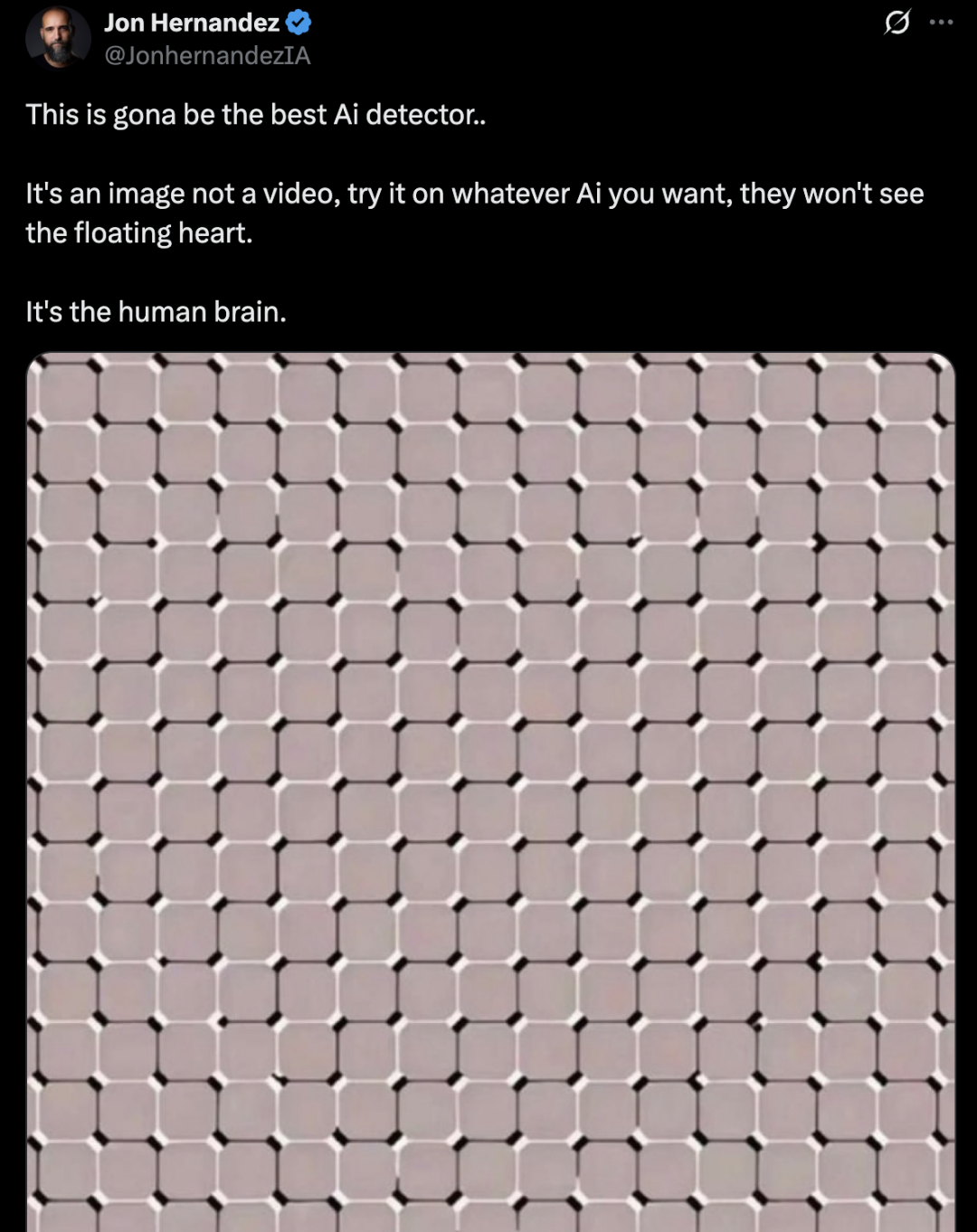 X 博主 @JonhernandezIA 认为这种光学错觉可以成为一个「AI 检测器」,因为人类大脑的生物特性(容易受到错觉影响)与 AI 的计算特性(依赖数据和算法)存在显著差异。