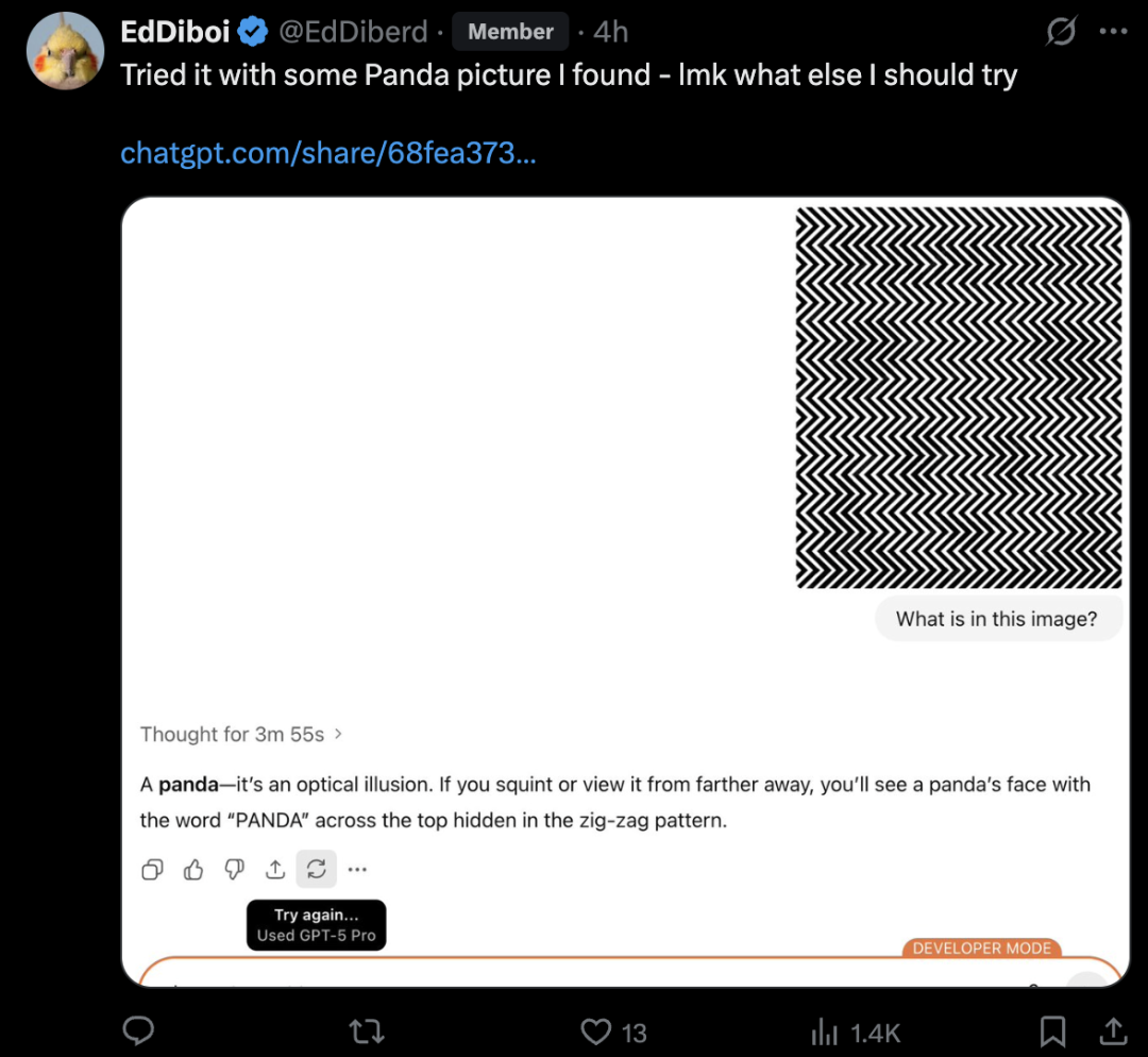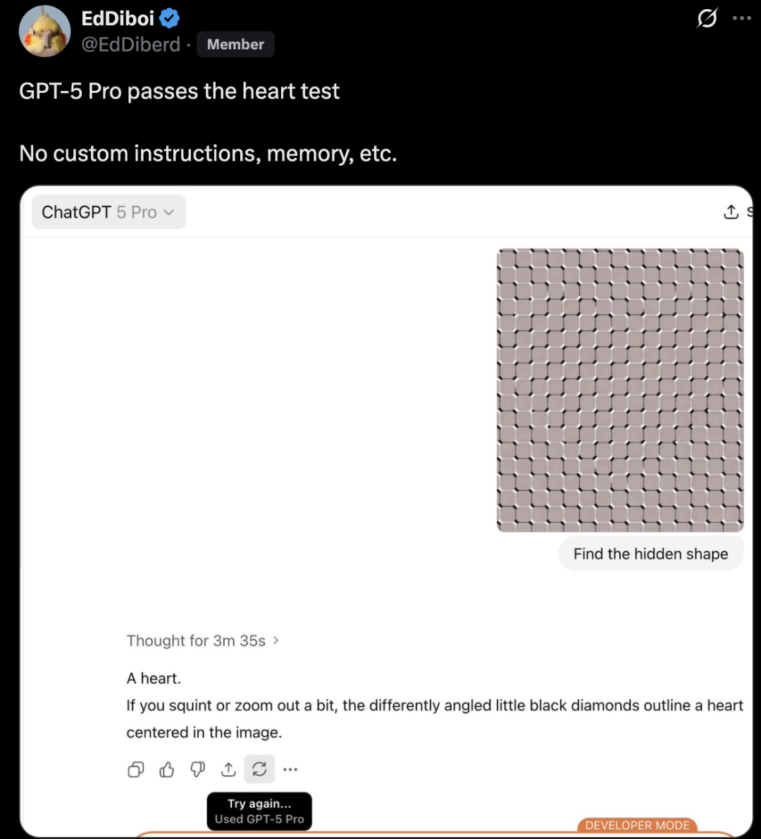 网友 @EdDiberd 在稍晚时间使用 GPT-5 Pro,没有依赖模型的定制功能或者记忆功能,直接上传图片并输入提示词:Find the hidden shape,这次 GPT-5 Pro 给出了正确答案。