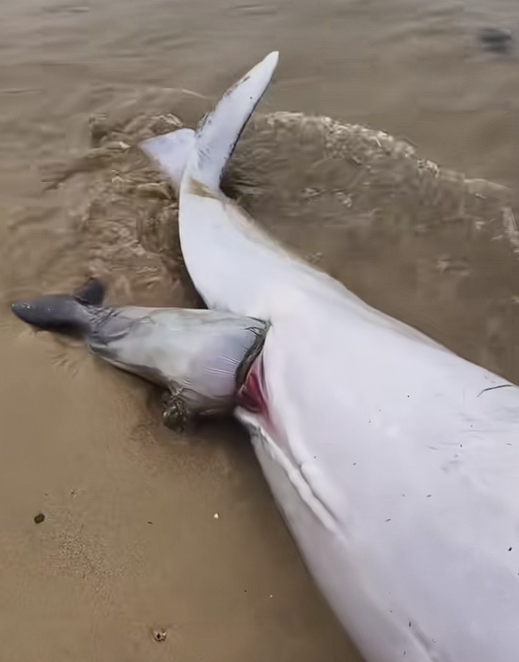 从网上流出的视频看,这只成年白海豚吻部修长,身体呈现出灰白色并带有斑点,一同死亡的还有其腹中的幼崽。