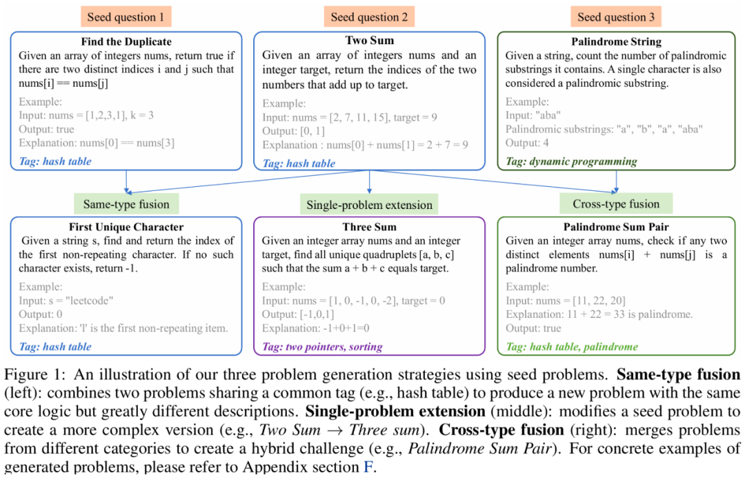 单题扩展 (Single-problem extension):在保持核心逻辑的前提下,对单题进行结构性修改(如收紧约束、增加条件、改变输入格式)。例如 Two Sum → Three Sum。该策略能保持问题范式一致,同时迫使模型在算法复杂度上做出新权衡。