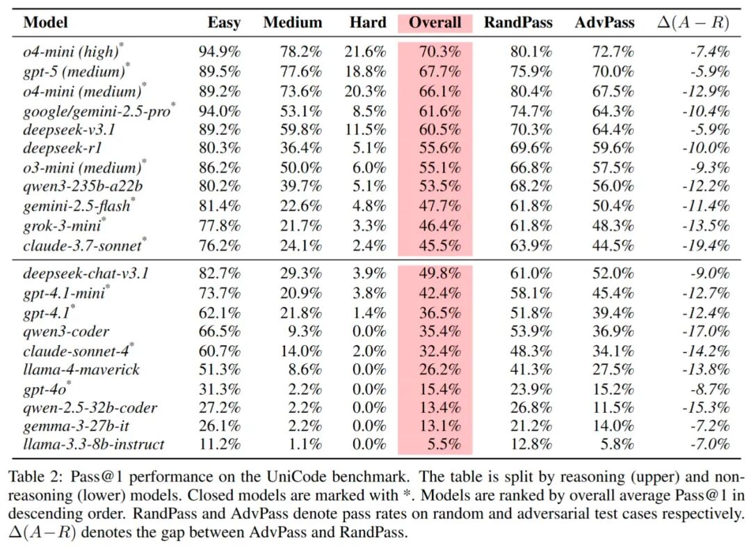 高挑战性:即便是排名第一的模型(o4-mini-high),总体 pass@1 也只有 70.3%;在较难题目上,大部分模型表现断崖式下降,说明 UniCode 框架能够生成具有高挑战性的算法题,暴露模型真实的算法能力差异。
