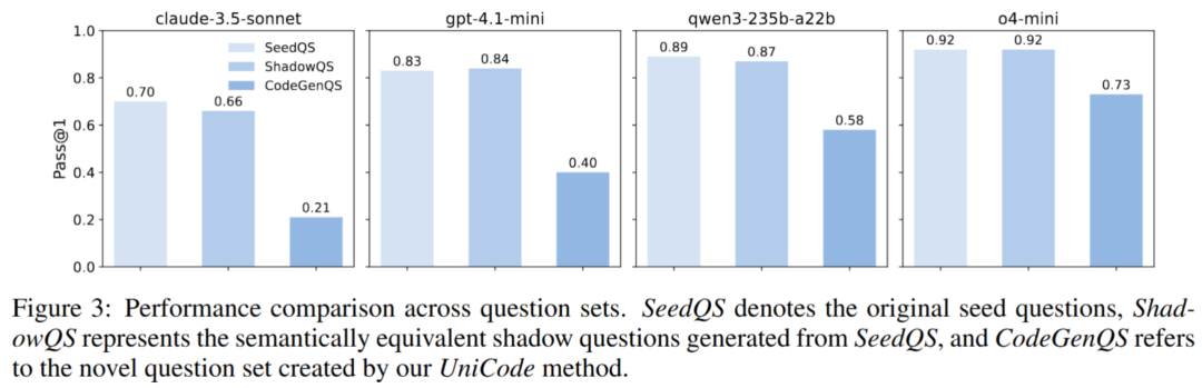实验显示:多数模型在 SeedQS 与 ShadowQS 上表现几乎一致,说明它们对表层叙述变换具有较强鲁棒性;但在 CodeGenQS(由 UniCode 生成、要求组合或迁移算法能力的题目)上,模型普遍出现显著下跌 —— 论文给出若干例证:claude-3.5-sonnet 从 0.70 跌至 0.21,gpt-4.1-mini 从 0.83 跌至 0.40,整体上模型在 UniCode 问题上的平均性能下降超过 30%,而在仅为叙述改写的 ShadowQS 上几乎无变化。