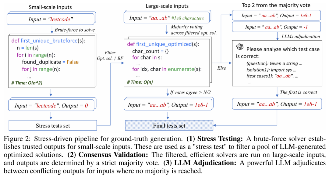 小规模暴力求解(Brute-force)+压力测试(Stress test):对能在小输入下暴力枚举的题目,先由 LLM 生成一个以正确性为优先的「暴力算法」并在小规模输入上运行,得到被信任的输入 — 输出对,这些对用作「压力测试集」去筛选一组来自不同 LLM 的高效候选解。