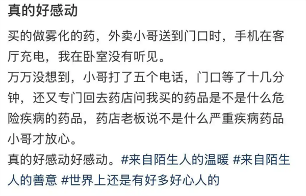 “万万没想到,小哥打了五个电话,门口等了十几分钟,还又专门回去药店问我买的药品是不是什么危险疾病的药品,药店老板说不是什么严重疾病药品小哥才放心。真的好感动好感动。”