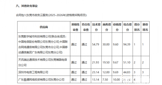 其中,东莞数字城市科技有限公司(联合体成员东莞电信、东莞联通、东莞移动)以94.39的综合得分断层排名第一;