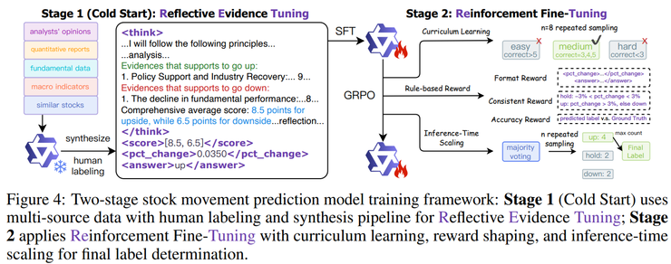 在这项研究中,作者利用中国 A 股市场的大规模股票走势预测数据集,对他们提出的 RETuning(反思式证据调优) 方法进行了系统验证,结果表明这种方法确实显著提升了大语言模型在金融预测任务中的表现。