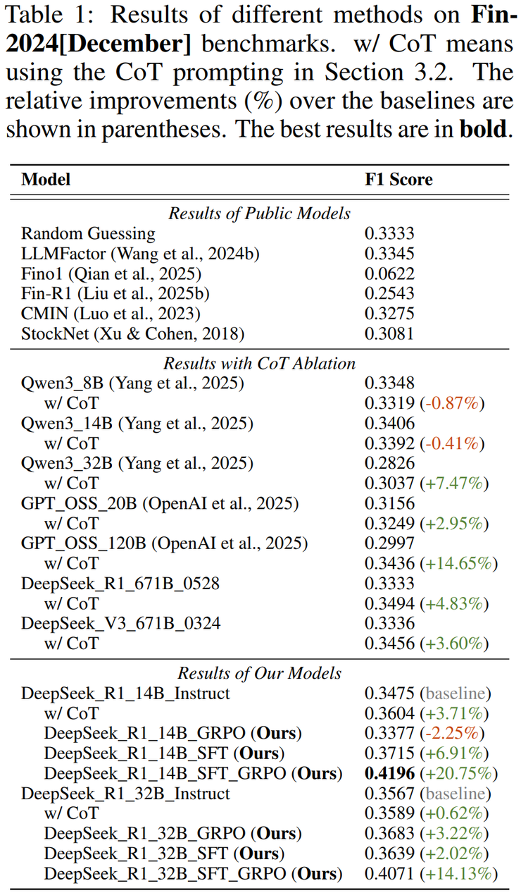 首先,从总体效果来看,RETuning 模型(如 DeepSeek_R1_14B_SFT_GRPO)在三分类任务:预测股票“上涨、持平、下跌”中取得了明显优势。与主流的基础模型相比(包括 ChatGPT、LLaMA3-8B、Mistral 等),RETuning 的 F1 分数平均高出 10% 到 20%,说明它不仅能更准确地区分股票走势方向,还能在不同类别之间保持更平衡的预测效果。这种提升在金融任务中非常罕见,因为股票数据噪声大、随机性强,能有双位数的提升已经算是非常显著的成果。