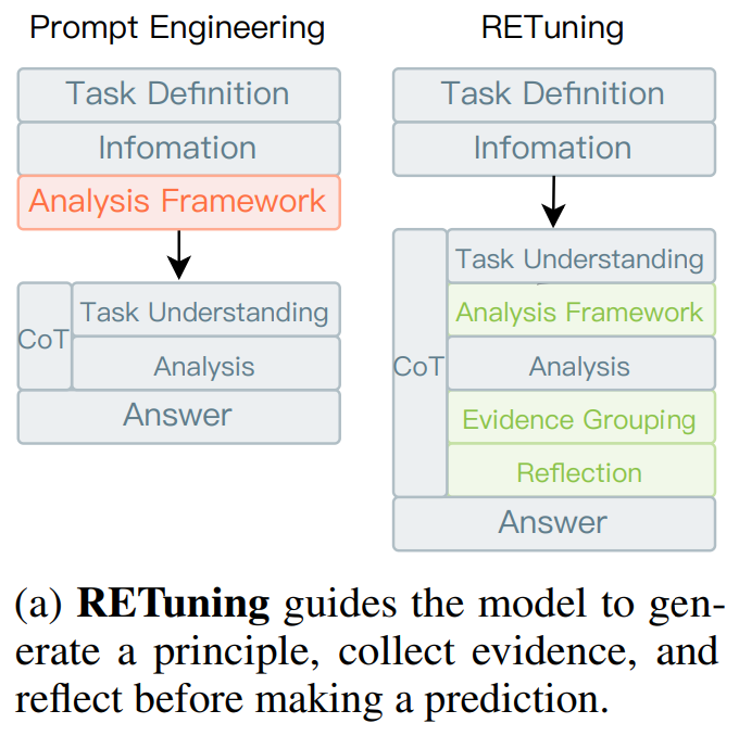 他们提出了一种名为 RETuning 的方法,让大语言模型在做出预测前,先搜集证据、分析逻辑、反思推理,再得出结论。换句话说,模型不再是“凭直觉判断”,而是学会了“有理有据地思考”。