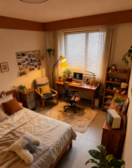 不是那种千篇一律的样板房照片,而是一张真正能让人产生「家」的联想的图景:可能是阳光透过宽大的落地窗,温柔地洒在精致的木地板上,推窗见绿,窗外远处的景色是城市天际线,夕阳下的城市熠熠生辉。