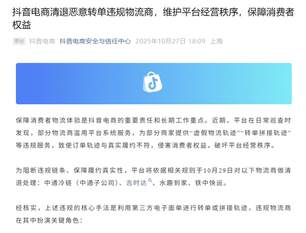 值得注意的是,日前抖音电商还发布公告,宣布对4家存在违规行为的物流商实施清退处理,其中包括中通冷链(中通子公司)、吉时达、水趣到家、铁中快运。