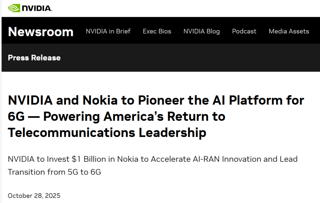 美国时间10月28日,英伟达宣布将向诺基亚投资10亿美元,推动AI-RAN创新和6G演进。
