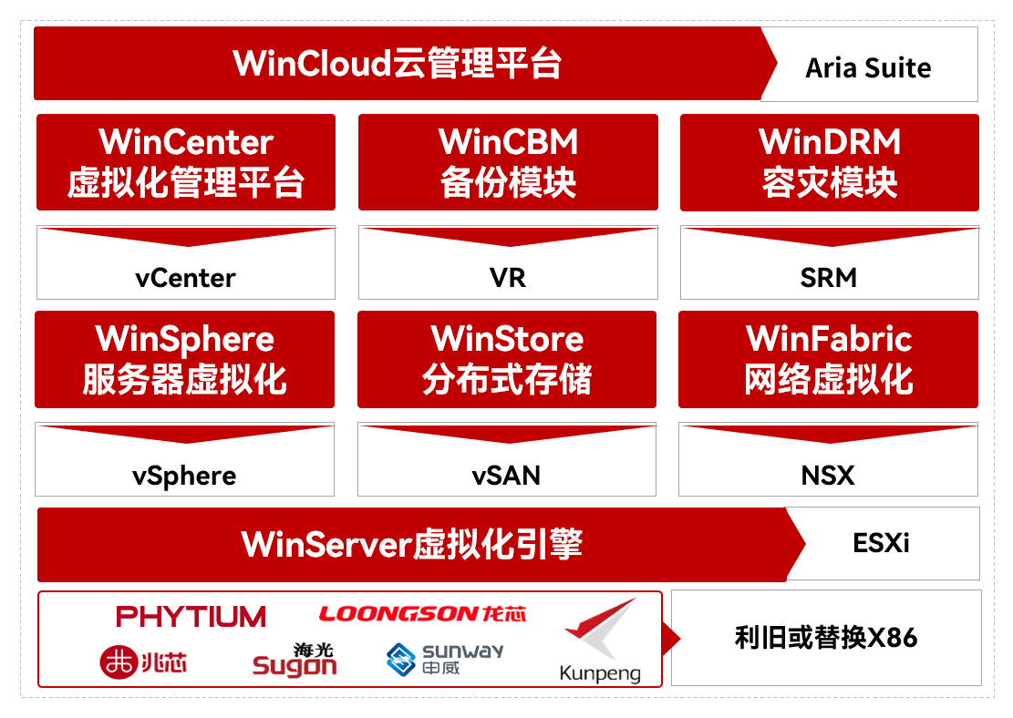 云宏CNware作为中国虚拟化软件领航者,具备全场景同位替代VMware的能力,凭借高度一致的产品矩阵与灵活部署的产品形态,可针对企业不同业务场景提供精准匹配的替代方案。