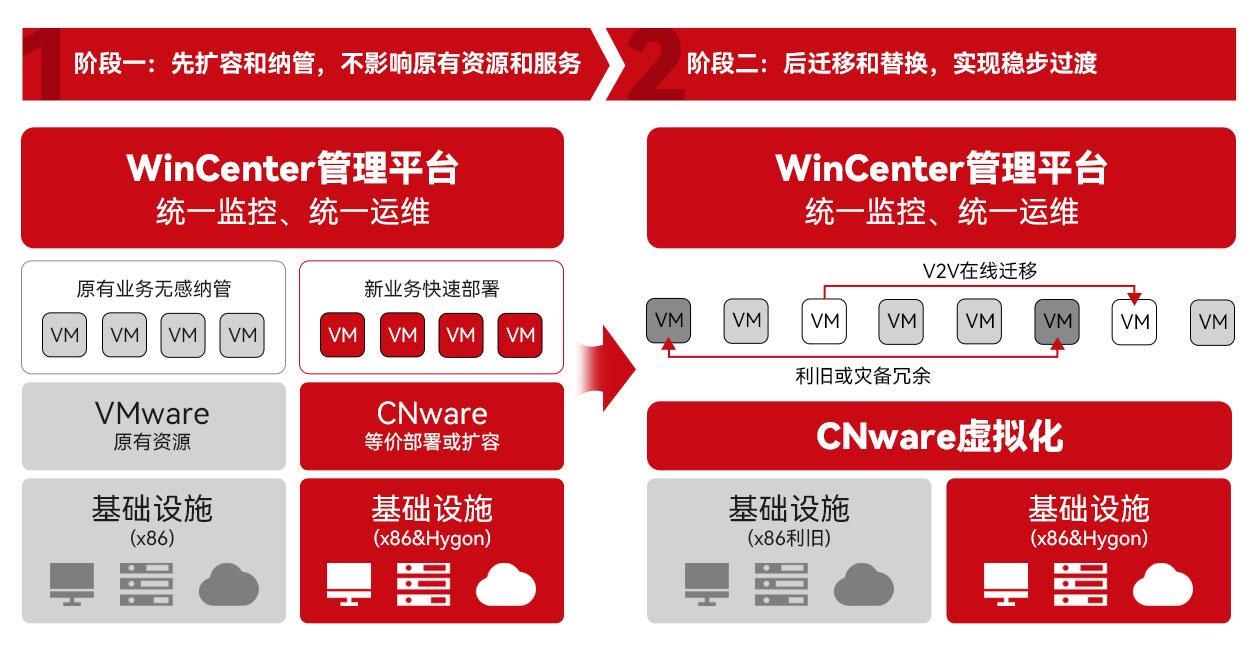 此外,该方案支持渐进式的信创转型路径。企业可以在保持现有x86架构的同时,逐步引入国产CPU,通过WinCenter统一管理平台实现异构资源的池化管理。同时也可以采用CNware WinStore分布式存储替换FC SAN集中式存储,从而满足存储层的信创要求。