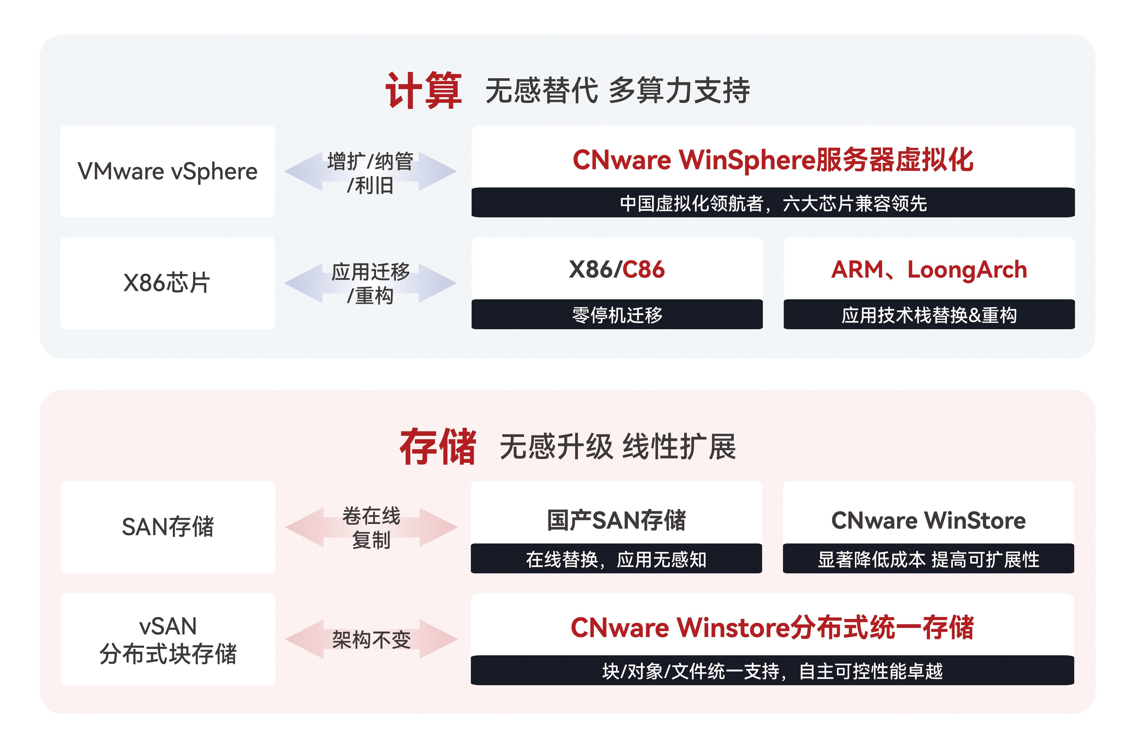 对于已部署VMware全栈SDDC的大型企业,云宏CNware提供渐进式替代方案。该方案延续VMware模块化设计理念,通过统一管理平台实现整体运维,使现有运维团队能够无缝衔接。在性能层面,CNware不仅在全闪存存储场景下提供更强的IO性能,一云多芯与软硬件解耦特性还支持更广泛的异构云平台纳管,具备更开放的生态扩展性。同时,方案完整支持x86与国产化芯片的混合部署,为企业构建安全可控的云基础设施奠定基础。