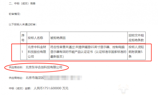 值得一提的是,有一家公司未通过初审,中科金财因符合性审查未通过:未提供辅显65英寸显示器、控制电脑显示器有效的节能产品认证证书(认证标准非国家标准的最新版本),被拒绝投标。