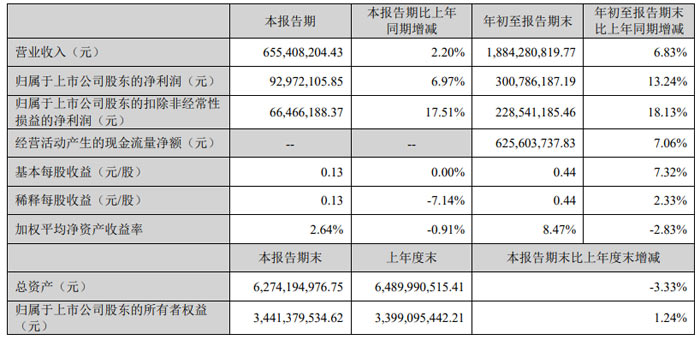 年初至报告期末(2025 年 1-9 月),公司实现营业总收入 18.84 亿元,较上年同期的 17.64 亿元同比增长 6.83%;实现归属于母公司股东的净利润 3.01 亿元,同比增长 13.24%;扣除非经常性损益的净利润 2.29 亿元,同比大幅增长 18.13%,基本每股收益 0.44 元,较上年同期的 0.41 元增长 7.32%。