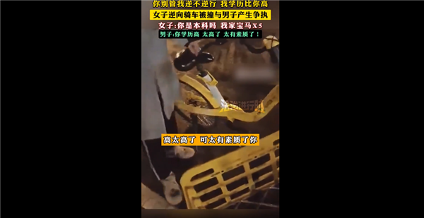 女子逆向骑车被撞与男子产生争执,女子大喊:“你是本科吗?我家宝马x5!你别管我逆不逆行,我学历比你高,我想逆行就逆行”。