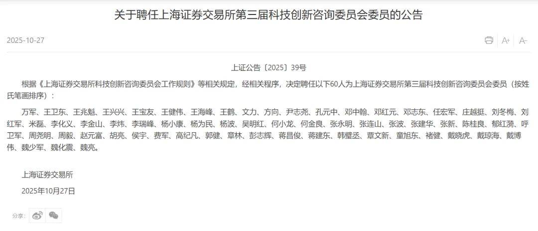 10月27日,上交所发布聘任第三届科技创新咨询委员会委员的公告。第三届咨询委由60名委员组成,主要来自科研院所、链主企业、国家部委机关等,以连任委员为主,同时增补人工智能、机器人、商业航天、低空经济等未来产业领域专家。强脑科技创始人兼CEO韩璧丞、宇树科技创始人王兴兴、智元机器人联合创始人兼CTO彭志辉等均在其中。