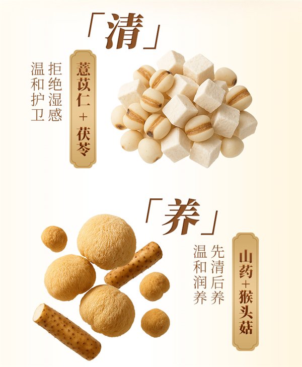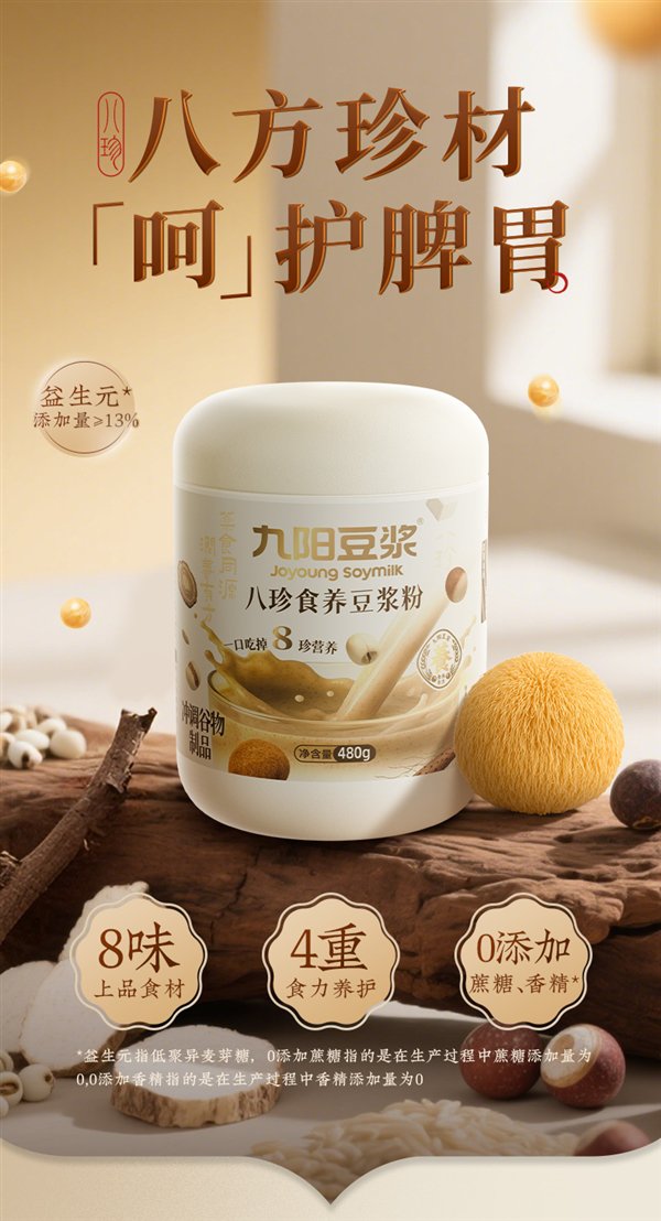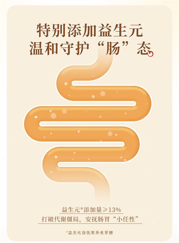 8味上品食材+4重食力呵护+益生元添加量≥13%,0添加蔗糖、香精。