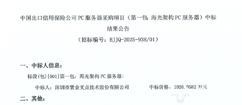 10月20日,中国出口信用保险公司PC服务器采购项目(海光架构PC服务器)中标结果公布。据悉,该项目是该招标人的年度招标项目,2023年、2024年均发起过,而今年的项目预算为2043.96万元,划分1个标段,不允许联合体投标。