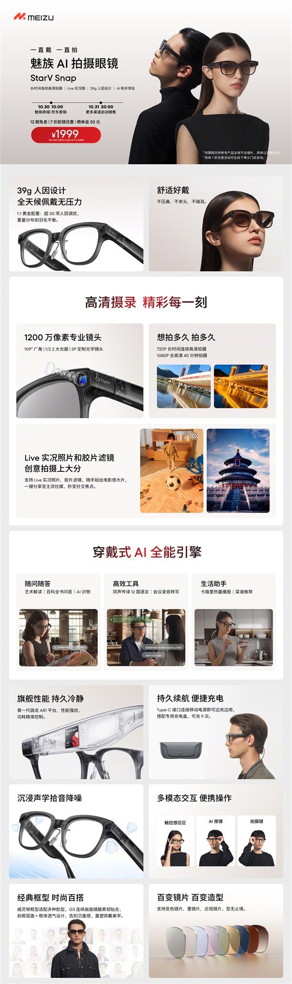在此前的魅族22发布会上,魅族还推出了StarV Snap AI拍摄眼镜,今天终于正式上市,定价1999元起。