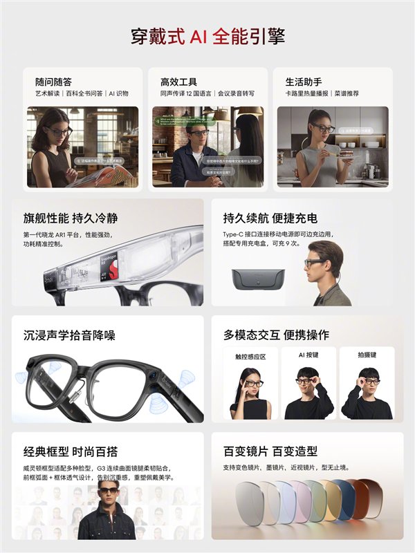 内置穿戴式AI全能引擎,支持随问随答(艺术解读、百科问答、AI识物)、高效工具(同声传译12国语言、会议录音转写)、生活助手(卡路里播报、菜谱推荐)等,且支持语音控制。