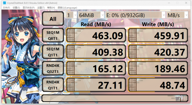 在使用 CrystalDiskMark 进行基准测试1G文件样本下,闪迪ELE移动固态硬盘的顺序读取速度达到 463MB/s,顺序写入速度 459MB/s,随机 4K读写分别达到 165.12 MB/s与 189.46 MB/s。这一成绩不仅超越了官方标称值,更在同级别产品中处于上游水平。