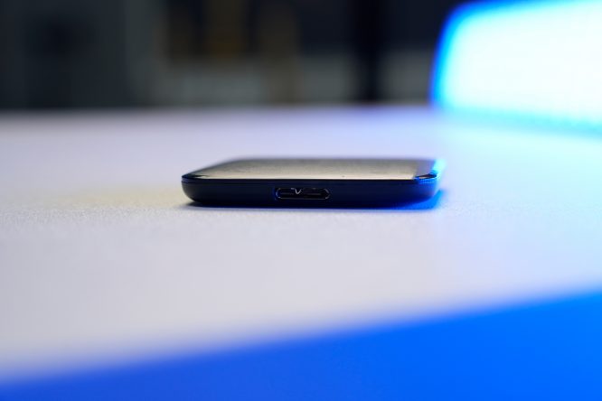 在细节处理上,microUSB3.0数据接口设置在底部,搭配包装内附赠的 Type-A转 Type-C 转接器,这点还是非常贴心的。值得一提的是,机身表面采用磨砂工艺处理,虽然在长期使用后会留下轻微指纹,但日常擦拭即可轻松清理,兼顾了实用性与美观度。