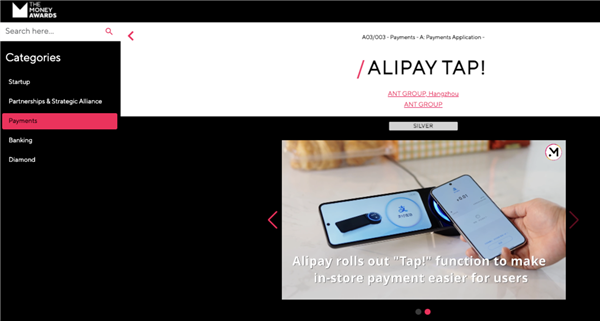 支付宝凭“碰一下”在万事达、摩根大通等一众知名企业的支付解决方案中脱颖而出拿下大奖,也成为获奖者中唯一的中国企业。