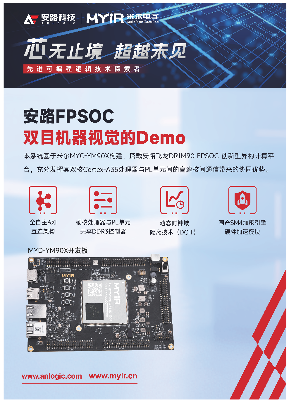 米尔电子应安路科技的邀请出席此次盛会,共同展出基于安路FPGA平台的飞龙派DR1M90的核心板和开发套件和基于安路FPSOC双目机器视觉demo。