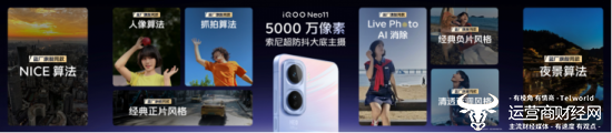 iQOO Neo11 配备后置 5000 万像素索尼超防抖大底主摄,并得到蓝厂旗舰同款 NICE 算法加持,同时影像玩法也有升级,全新的风格化光斑、负片、正片和清透蓝调等滤镜以及升级的 LivePhoto 动态照片、LivePhoto AI 消除和 AI 修图大师等,让出片更轻松。
