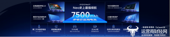 Neo11 实现 Neo 史上最强续航表现,搭载配备了第二代半固态电池技术和第四代硅负极技术的 7500mAh 超薄蓝海电池,即使在 -20℃ ~ 40℃ 的环境中,依然能稳定持久放电,并配备 100W 超快闪充且支持 PPS 和 PD 快充协议,让充电更自在;全新升级的全局直驱供电 2.0,支持智能温控,做到发热更低、损耗更少,有效延缓电池老化,边充边玩也安心。