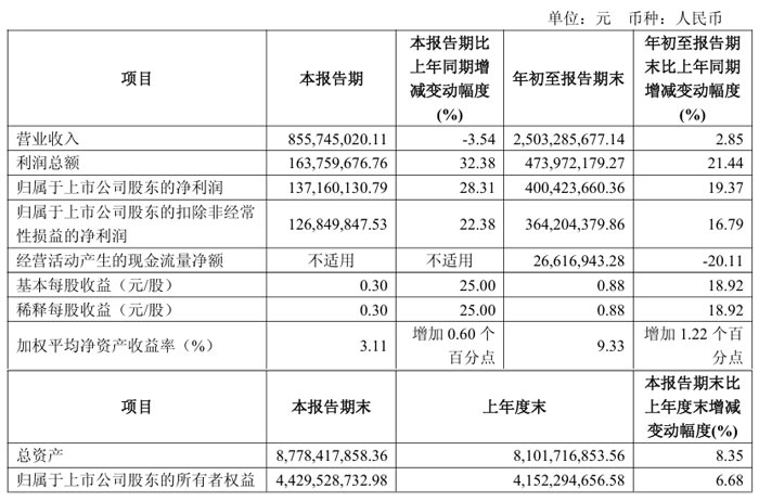 2025 年第三季度,公司实现营业收入 8.56 亿元,较上年同期的 8.87 亿元同比下降 3.54%;实现归属于上市公司股东的净利润 1.37 亿元,较上年同期的 1.07 亿元同比大幅增长 28.31%,盈利质量稳步提升。