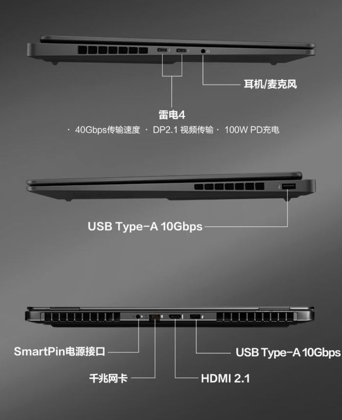 接口方面更是 “一步到位”:左侧双雷电 4(支持 USB4 40Gbps 传输、100W PD 充电、DP 2.1 视频输出)+ 耳机麦克风二合一接口,右侧 1 个 USB-A 3.2,后侧 DC 电源接口 + RJ45 千兆网口 + HDMI 2.1+1 个 USB-A 3.2。出差时不用带笨重的拓展坞,接外接屏、移动硬盘、网线都方便;就算在酒店里想连显示器剪片,一根 HDMI 线就能搞定,效率拉满。