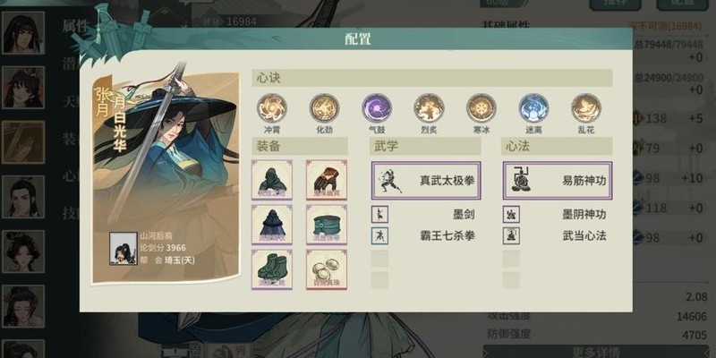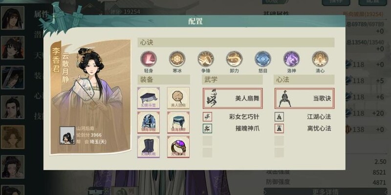 心诀搭配冲霄、真元、锻骨、气澜、迷离与清风,结合清寒套装提供的强大内力加成,内力轻松突破五万。辅以气澜及七玄气劲,不仅可有效辅助队友,还能在战斗中打出可观的特殊伤害。