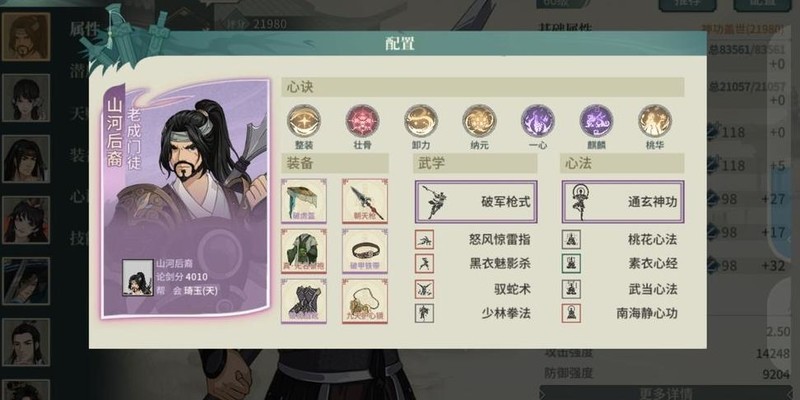 破军具备回血、护盾、驱散、提升负面状态抗性及范围减伤等多重能力,堪称全能型辅助。搭配主角使用桃花、素衣与通玄心法,可将其辅助效果发挥到极致,实现最佳战斗配合。