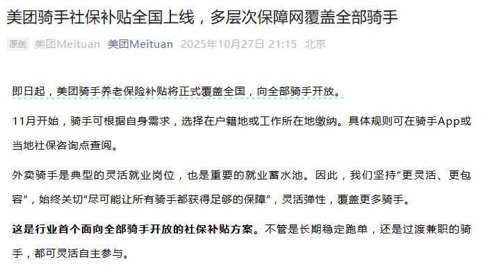10月27日,伴随美团官宣养老保险补贴全国覆盖的消息,美团惠及数百万骑手的“福利保障体系”,也全面揭晓。