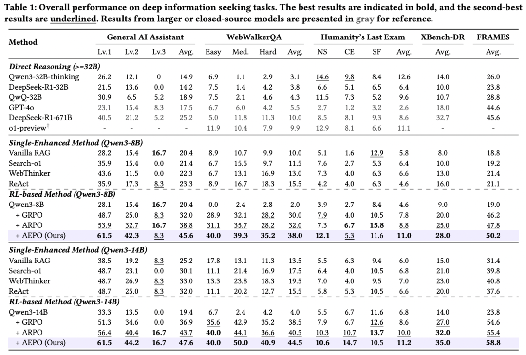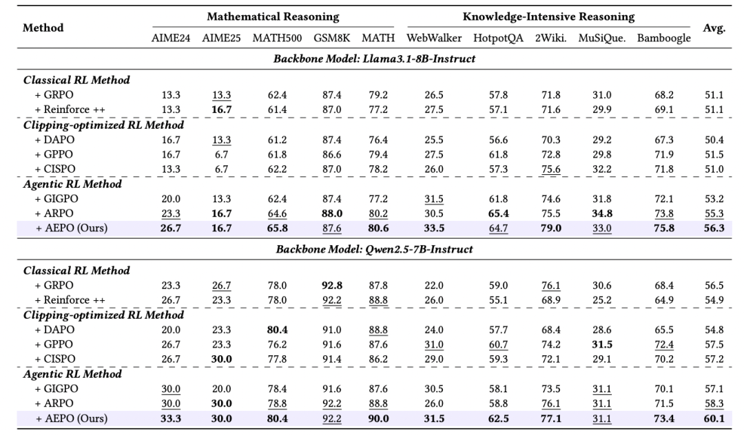 图 1:AEPO 性能概览:左图对比深度搜索任务性能,右图对比通用推理任务性能实验结果表明,AEPO 在 14 个跨领域基准上显著优于七种主流强化学习算法。特别是深度搜索任务的 Pass@5 指标:GAIA (65.0%), Humanity’s Last Exam (26.0%), WebWalkerQA (70.0%)。在保持训练稳定性的同时进一步提升了采样多样性与推理效率,为通用智能体的可扩展强化训练提供了新的优化范式。