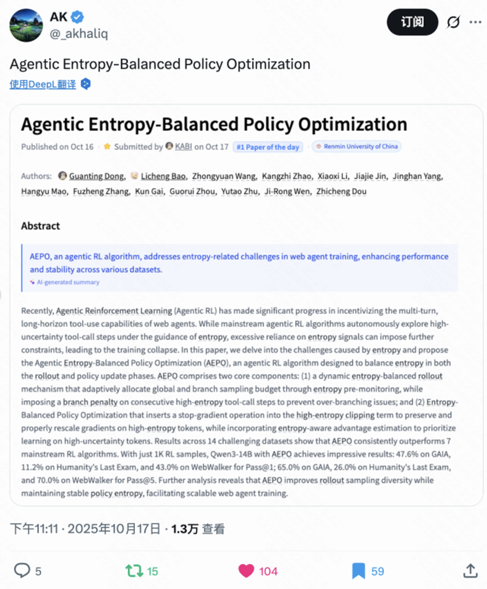 在 14 个挑战性基准上的实验结果表明,AEPO 在采样多样性、训练稳定性及工具调用效率方面均优于 7 种主流强化学习算法,为智能体在复杂开放环境下的可扩展训练提供了新的启发。