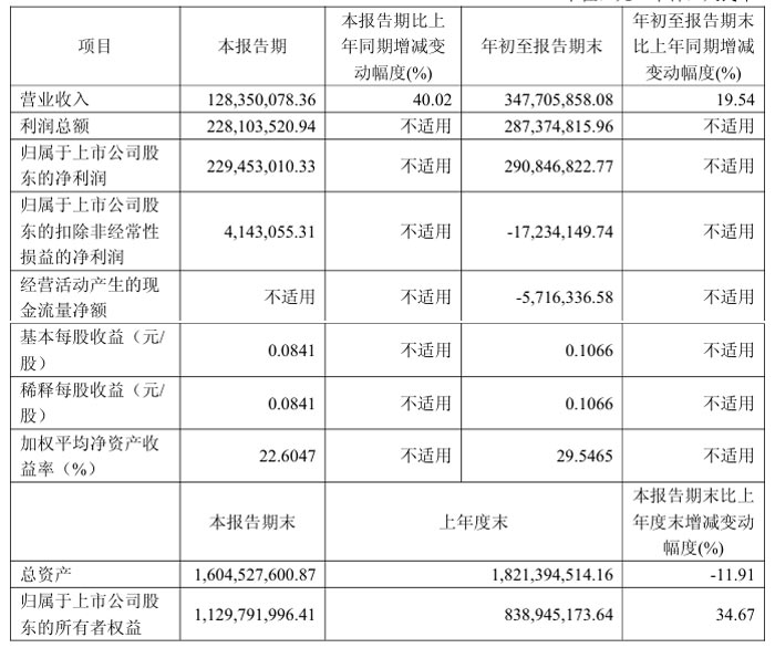 2025 年第三季度,公司实现营业收入 1.28 亿元,较上年同期的约 9166.55 万元增长 40.02%;归母净利润 2.29 亿元,较上年同期的亏损 2224.41 万元实现大幅减亏并扭亏为盈;扣非归母净利润 414.31 万元,较上年同期的亏损 2626.81 万元增加 3041.12 万元,盈利能力明显提升。