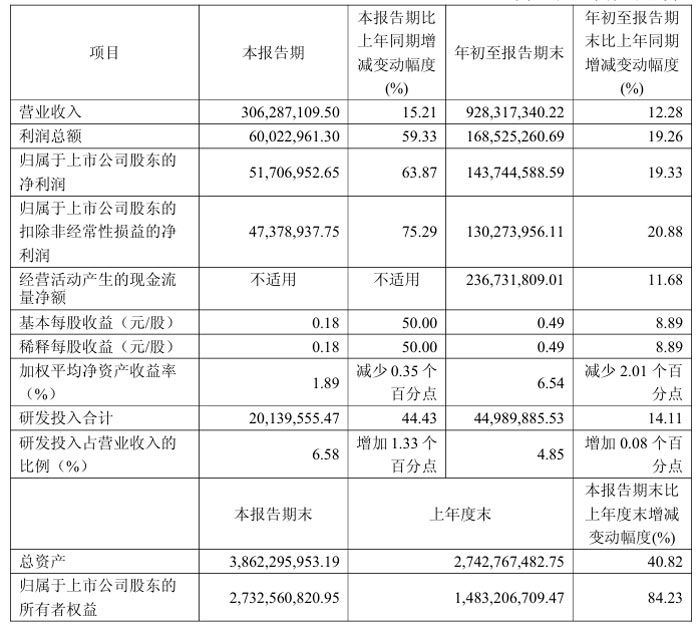 2025 年第三季度,公司实现营业收入 3.06 亿元,较上年同期的 2.65 亿元增长 15.21%;归属于上市公司股东的净利润 5170.69 万元,较上年同期的 3155.33 万元大幅增长 63.87%;归属于上市公司股东的扣除非经常性损益的净利润 4737.89 万元,较上年同期的 2703.03 万元增长 75.29%,盈利能力显著提升。