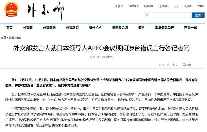 问:10月31日、11月1日,日本首相高市早苗在其社交媒体账号上连续发布两条APEC会议期间与中国台湾当局人员会面消息,配发有关照片,并称对方为台“总统府资政”。请问中方对此有何评论?