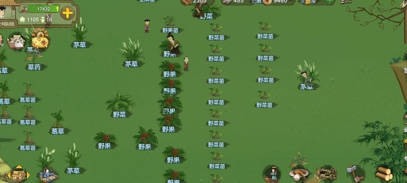 挖取地图上的14或15株野菜及10个野果,将获得的幼苗统一集中种植。