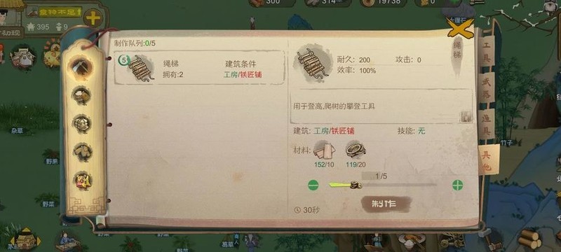 建好工房后先造两三件铁具,砍树制作绳梯,夏秋两季靠它上树摘桃。