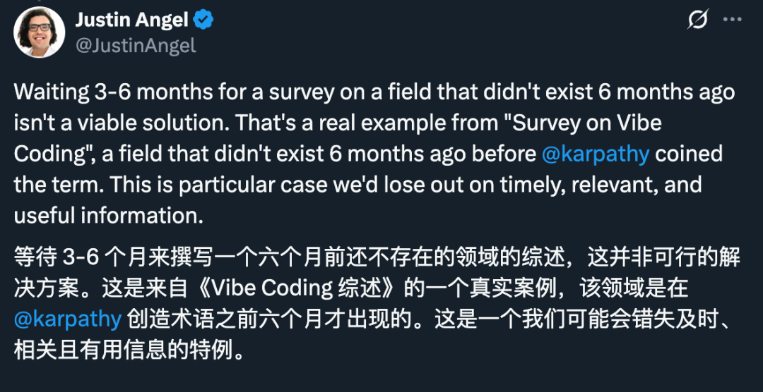 像「氛围编程」这样的新概念就是很好的例子:一个 6 个月前还不存在的方向,非要等 3–6 个月走期刊 / 会议流程,才能挂 arXiv,这会把最前沿、最时效的综述直接卡死。