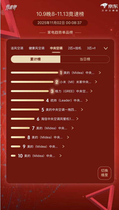 2025年京东双十一52H开门红落下帷幕,美的空调以绝对优势包揽多项第一:美的中央空调成交排名第一、品牌份额第一、店铺排名第一、单品断层式第一。其中美的空调酷省电系列包揽了万单品质空调、2匹+挂机、3匹+柜机多个单品榜的TOP1,新品酷省电Ultra销量突破1.4万套,表现出了强劲的市场号召力。除了京东,美的空调在天猫和抖音平台也同样精彩,连续登顶淘系全站空调品牌TOP1,抖音开门红登顶成交榜首,实现全渠道全面领跑。在行业定价趋稳、竞争转向理性的背景下,这样的战绩绝非偶然,其背后藏着美的空调对行业规律的深刻洞察与战略定力。